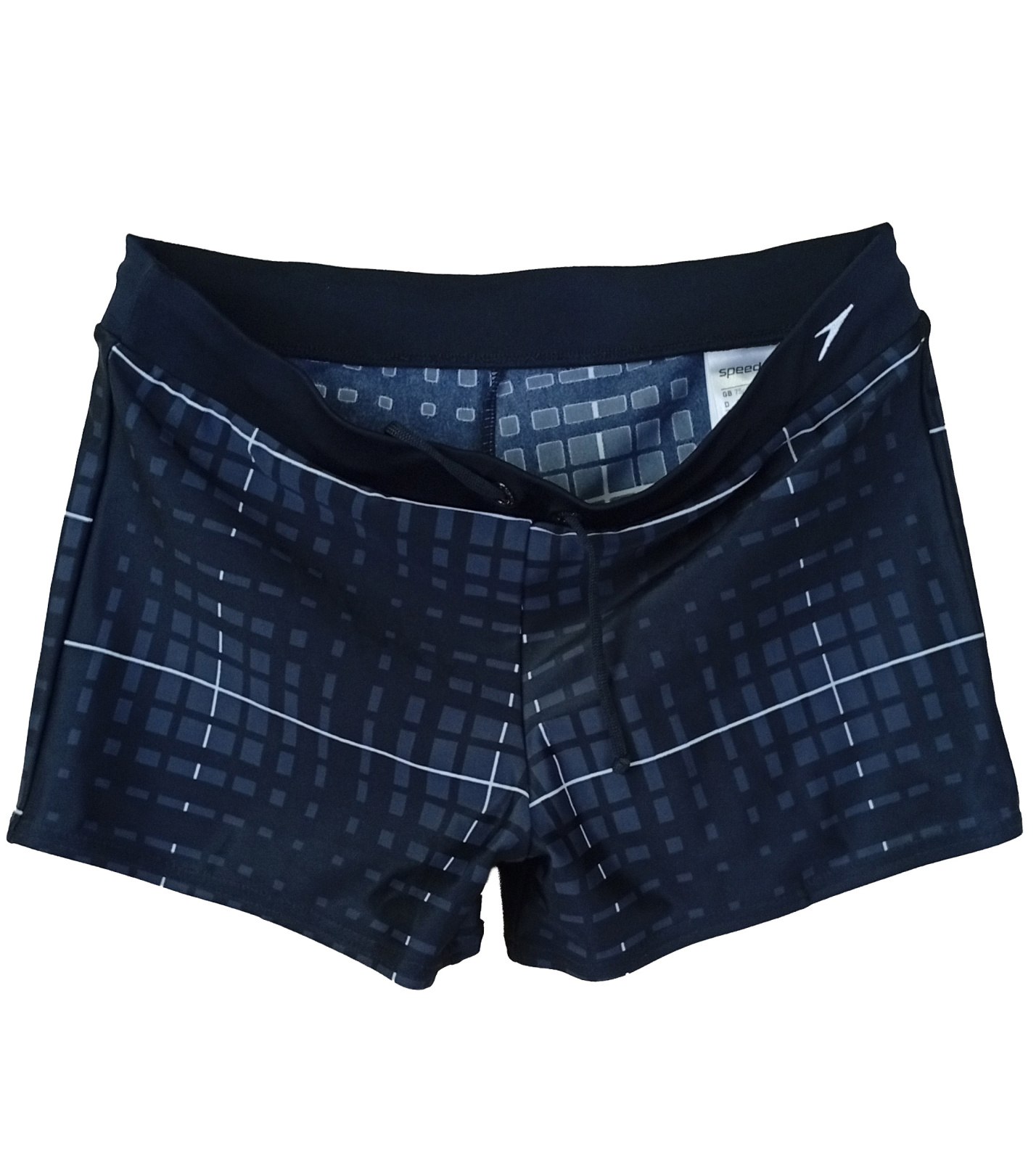Chlapčenské plavky - boxerky značky Speedo v čiernej farbe so zaujímavým geometrickým vzorom v tmavo modrej farbe. Moderný strih so šnúrkou v páse umožňuje individuálne utiahnutie a pohodlné nosenie. Materiál je rýchloschnúci, odolný voči chlóru a dobre drží tvar aj pri pravidelnom používaní. Tieto plavky kombinujú športový vzhľad s originálnym dizajnom, vďaka čomu sa hodia ako na tréningy, tak na rekreačné plávanie.