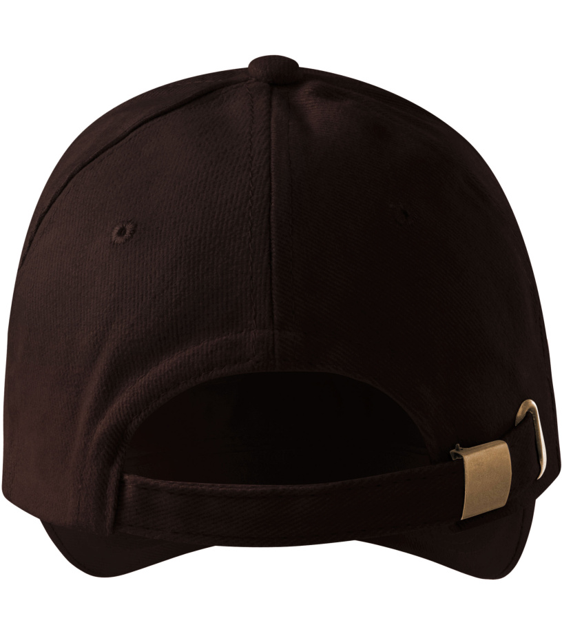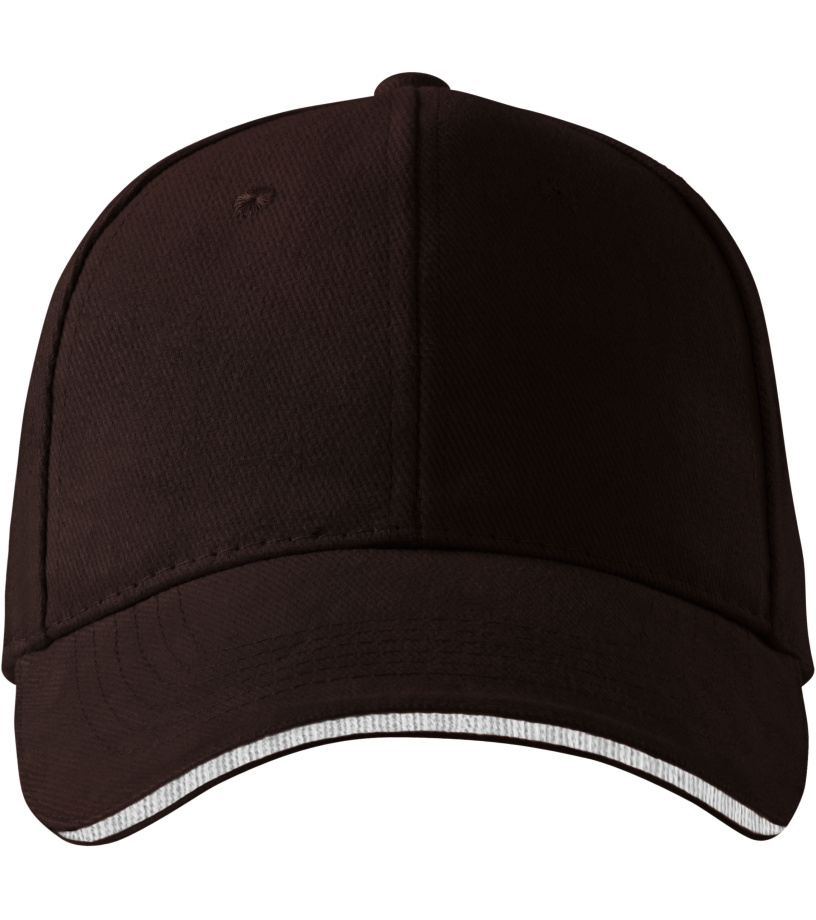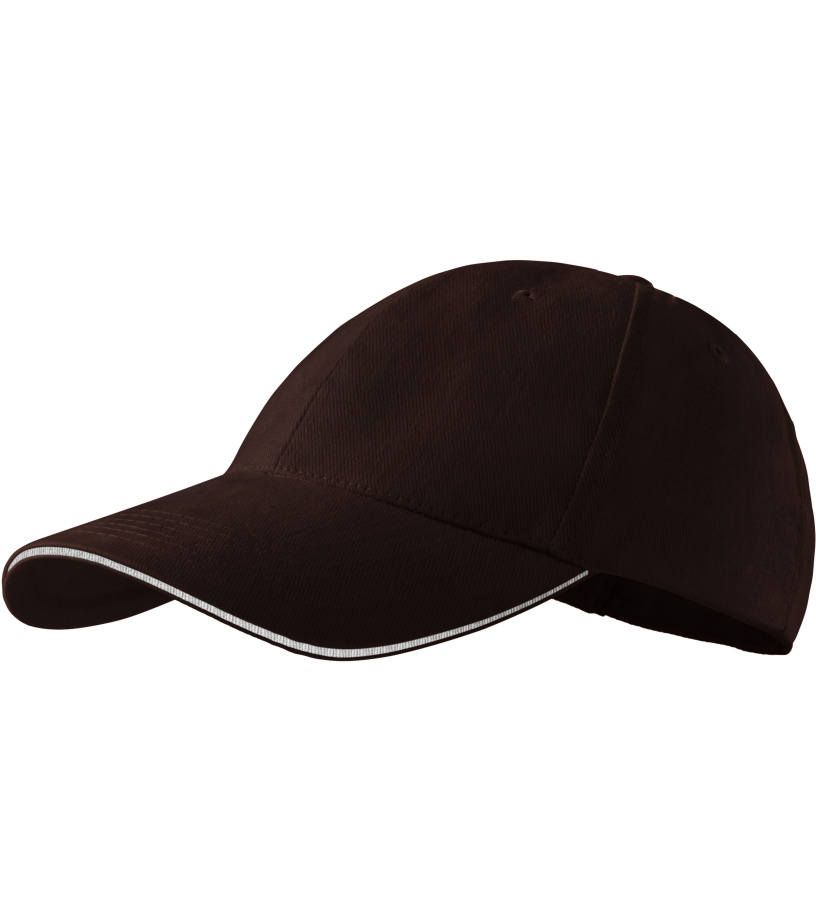 Šesťpanelová strihaná čiapka s prešívaným, mierne zahnutým kšiltom s kontrastným prúžkom vhodným na výšivku a potlač má zosilnené 2 predné panely, všité vetracie otvory, potný pásik a nastaviteľnú veľkosť s mosadznou sponou.