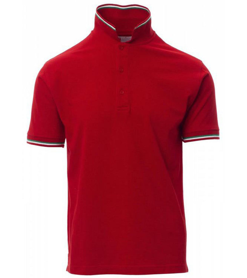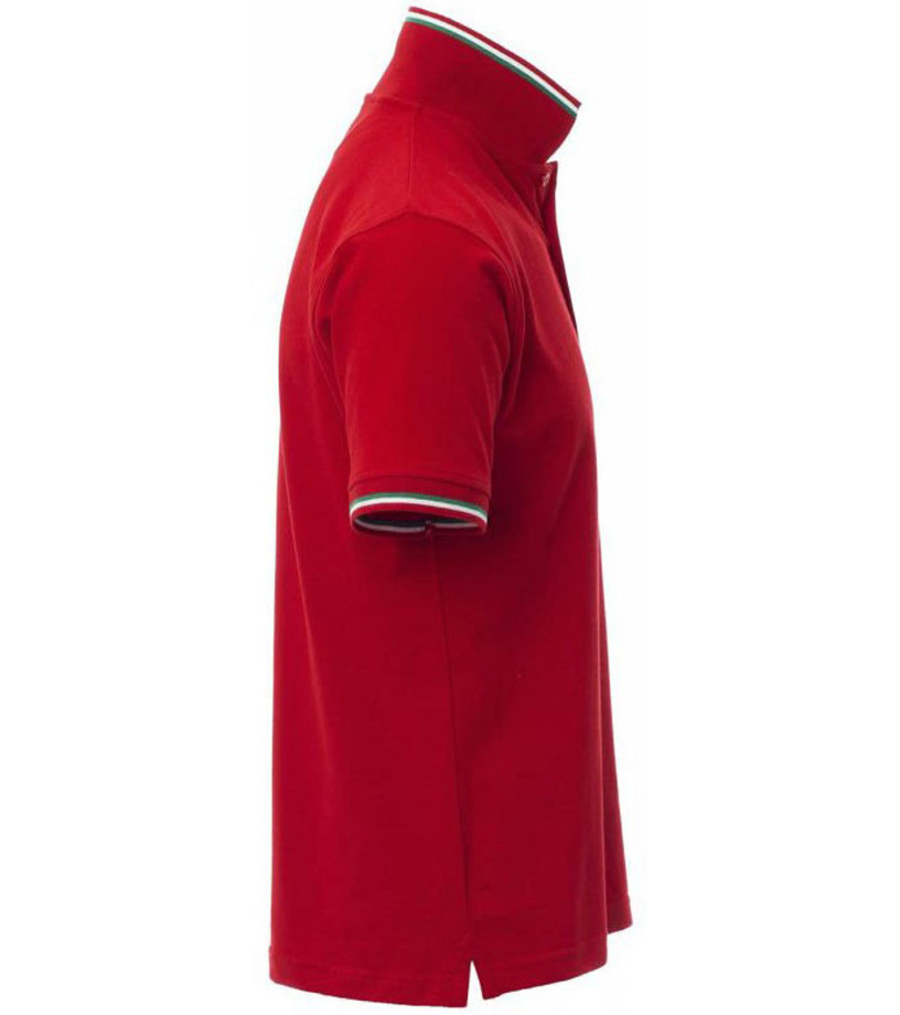 Polokošeľa s krátkym rukávom s 3 zladenými gombíkmi, kontrastné lemovanie vo farbe talianskej trikolóry pri krku a na rukávoch, rebrovaný lem pri krku a na rukávoch, postranné rázporky so zosilnenými švami, zakryté prešitie goliera, postranná vystužovacia páska goliera.