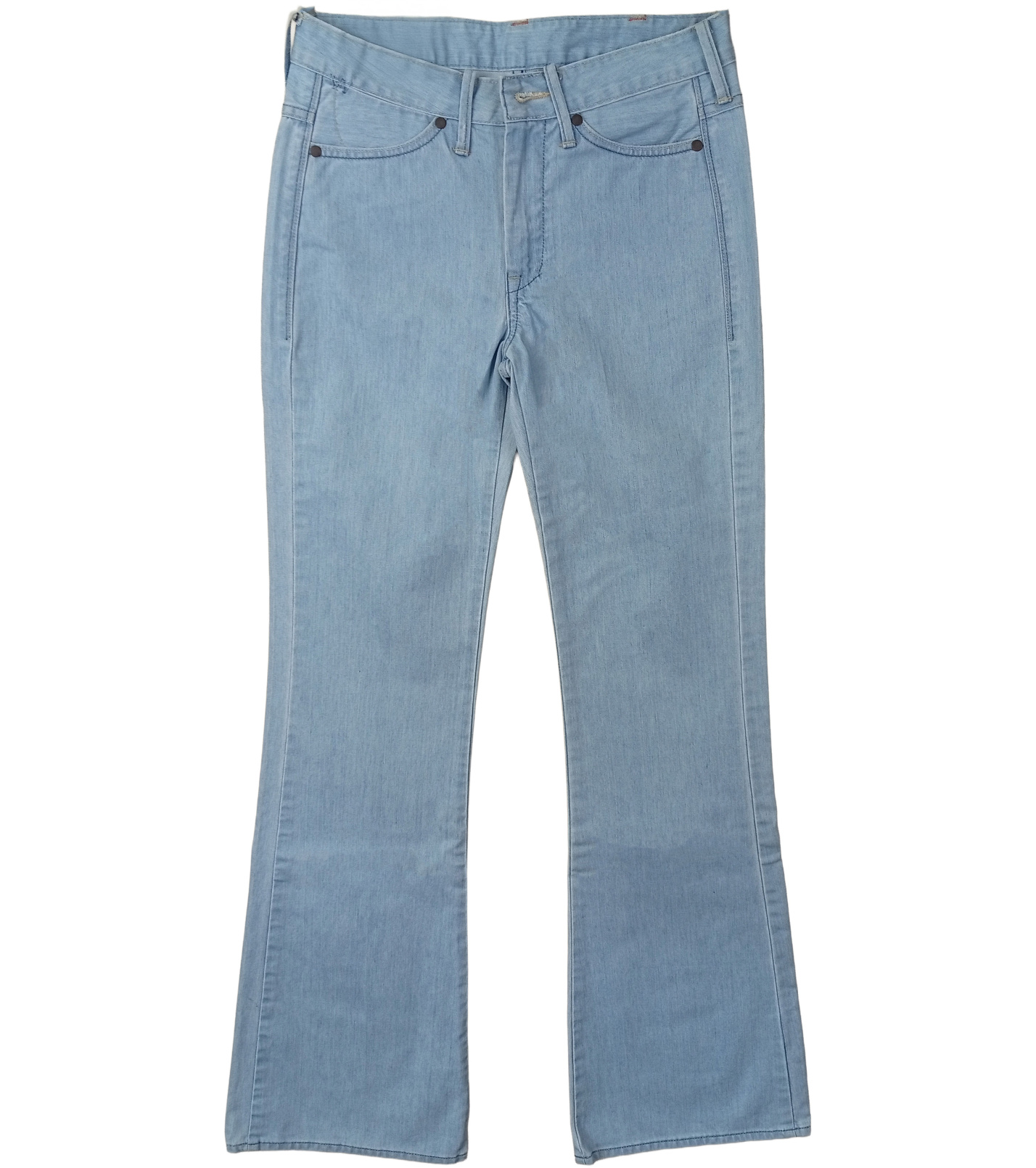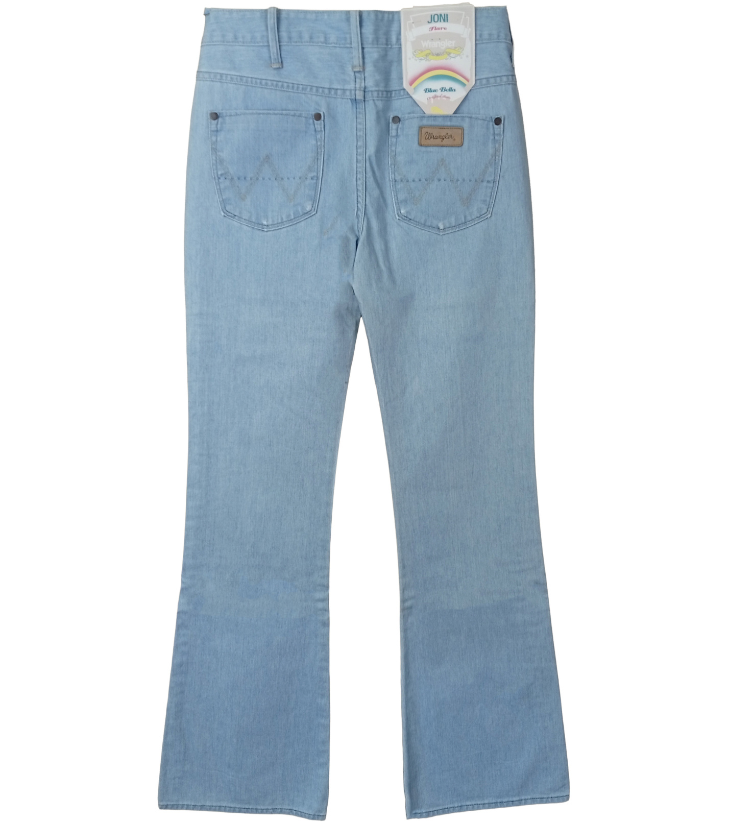 Nohavice majú klasické zapínanie na zips a kovový gombík, pútka na opasok a dve predné vrecká doplnené o malé vrecko. Zadnú časť zdobia dve vrecká s typickým prešitím v tvare „W“, čo je charakteristický znak značky Wrangler. Nad pravým vreckom sa nachádza kožený štítok s logom značky a papierový visačkový štítok označujúci rad Joni Flare Leg.