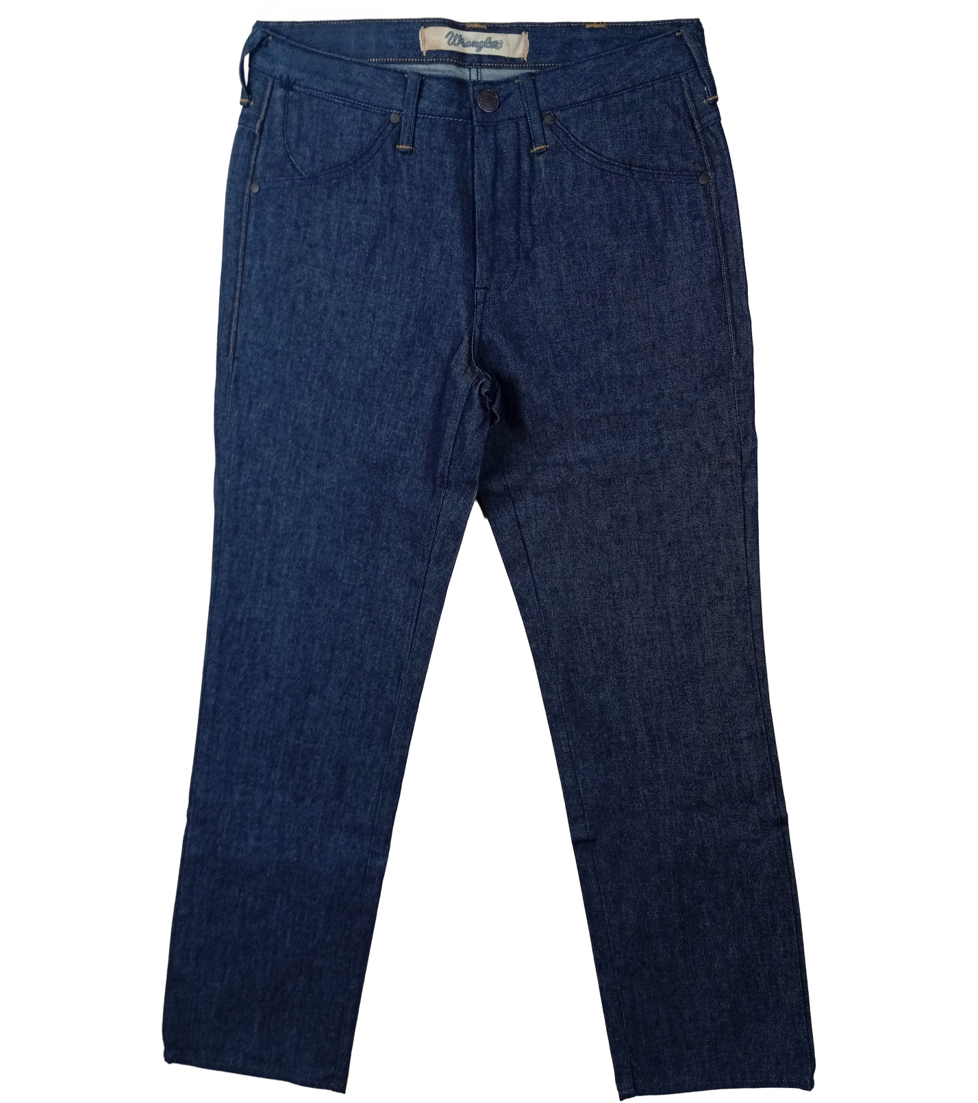Džínsy majú klasické zapínanie na zips a gombík, predné vrecká vrátane malého vrecka na mince a dve zadné vrecká s ikonickým prešívaním „W“. Nechýba ani kožený štítok Wrangler, ktorý podčiarkuje ich autentický charakter.