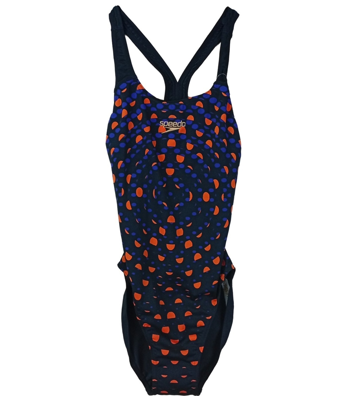 Dámske jednodielne plavky Speedo s moderným geometrickým vzorom v kontrastných oranžovo-modrých tónoch na tmavom podklade. Športový strih s vykrojeným chrbtom a tenkými ramienkami do kríža zaisťuje maximálnu voľnosť pohybu a pohodlie pri plávaní. Plavky sú vyrobené z kvalitného, rýchloschnúceho materiálu, ktorý dobre drží tvar a je príjemný na nosenie. Ideálna voľba pre pravidelný tréning aj rekreačné plávanie, kedy oceníte kombináciu funkčnosti, odolnosti a výrazného designu.