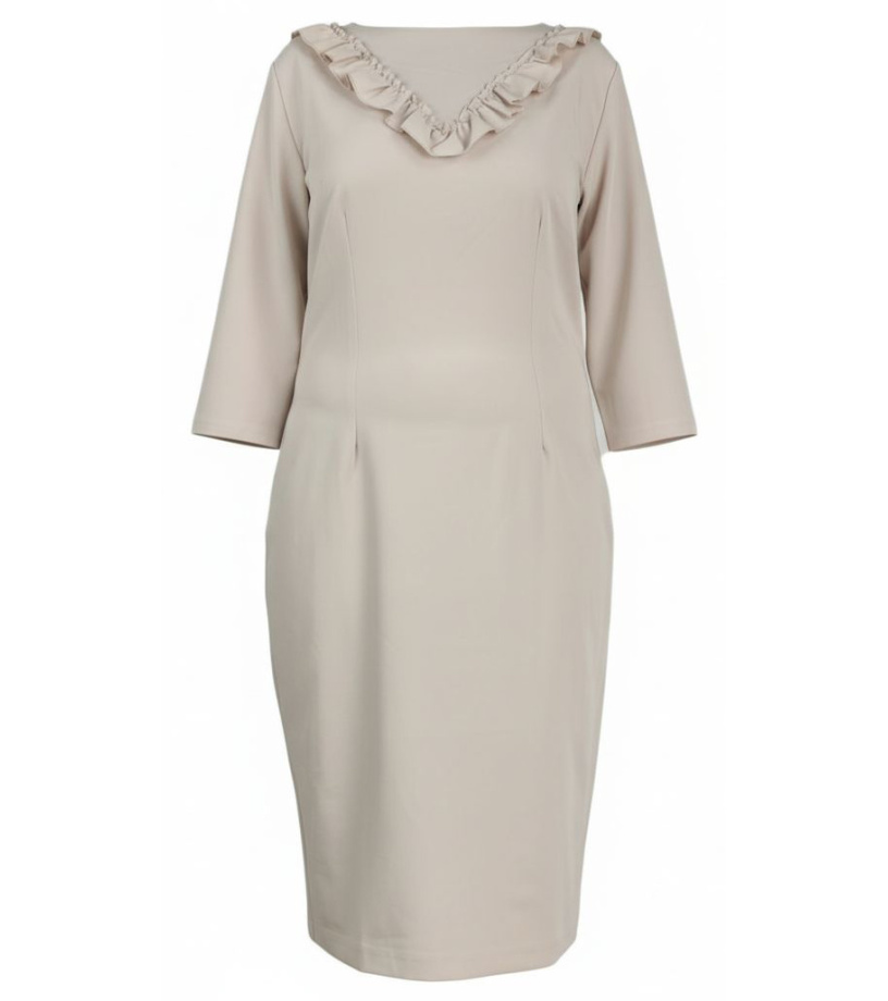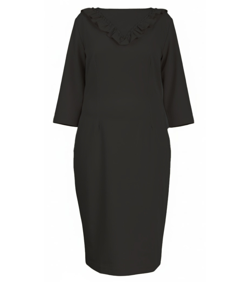 Dámske spoločenské šaty s 3/4 rukávmi. Šaty sú mierne vypasované, dĺžka je po kolená. Na prednej strane sú prsné záhyby a vzadu zips na uľahčenie obliekania. Výstrih je okrúhly, kanýrové zdobenie robí šaty elegantnejšími.