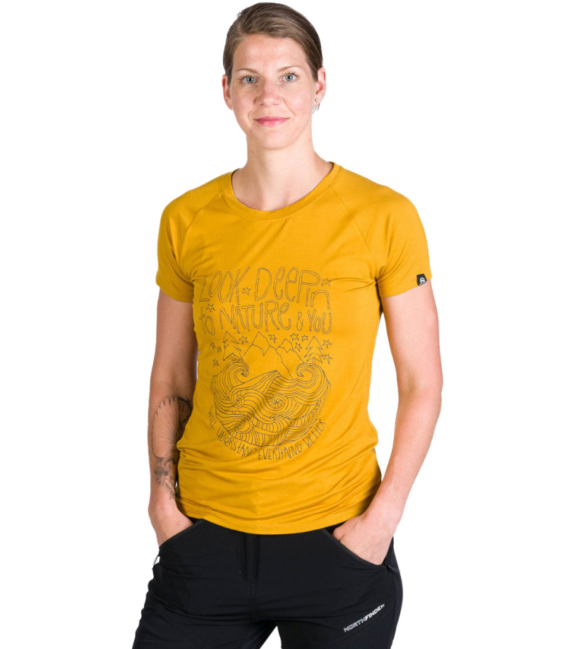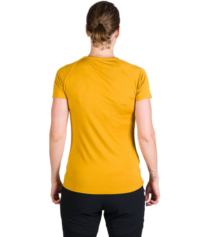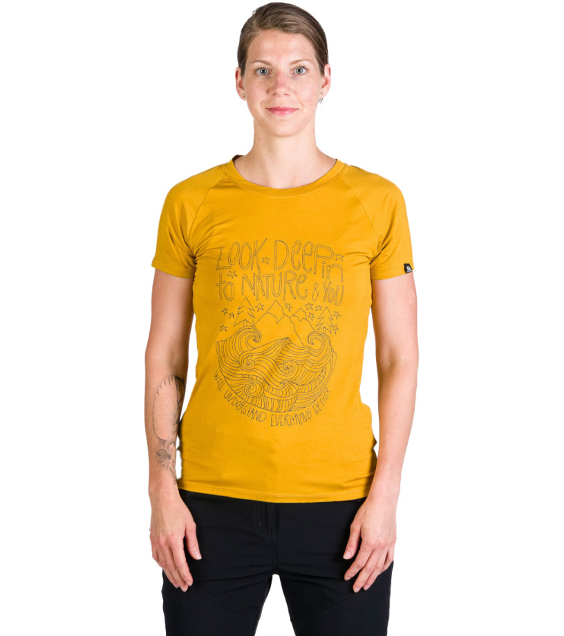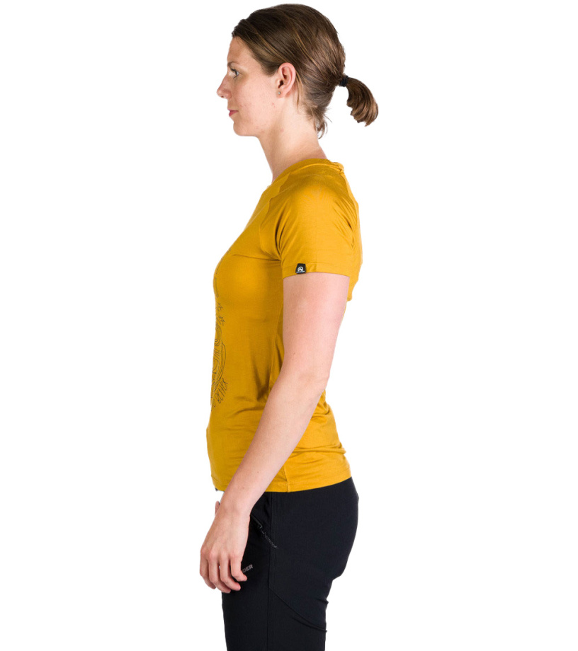 Dámske tričko vyrobené zo zmesi bambusu a spandexu. Priedušný a veľmi ľahký, splývavý a pohodlný materiál. Vhodné pre aktivity s menšou intenzitou záťaže a cestovania. Možnosť využiť aj ako voľnočasové tričko. Vďaka pridanému spandexu je materiál elastický a zaistí tak dostatok voľnosti na pohyb. Samotné bambusové vlákno je veľmi savé a dokáže odviesť od tela až 4x viac vlhkosti ako bavlna, nedráždi kožu a nenasáva pachy. Priekrčník a ramenné švy trička sú začistené šikmým prúžkom, takže švy nedrú do ramien ani pri nosení batohu. Vpredu s originálnou potlačou.